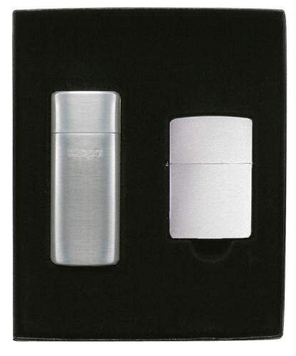 Classic style and contemporary convenience. Gift set includes a brushed chrome Zippo lighter and all metal pocket ashtray perfect for the discriminating smoker.